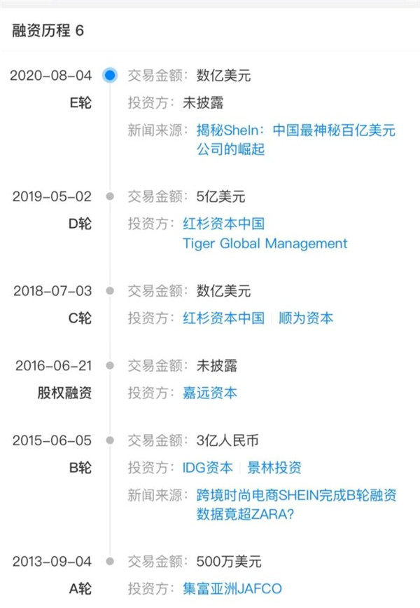 創(chuàng )立至今,SheIn經(jīng)歷至少5輪融資。根據天眼查APP,SheIn的第一輪融資發(fā)生在2013年,投資方集富亞洲JAFCO注資了500萬(wàn)美元。在隨后的幾年里,SheIn幾乎保持著(zhù)一年一輪融資的節奏。