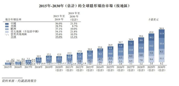 市場(chǎng)容量上,灼識咨詢(xún)報告顯示,中國作為全球第二大市場(chǎng)的整體隱形矯治市場(chǎng),零售銷(xiāo)售收入預期將由2019年的14億美元增至2030年的119億美元,復合年增長(cháng)率達21.5%。