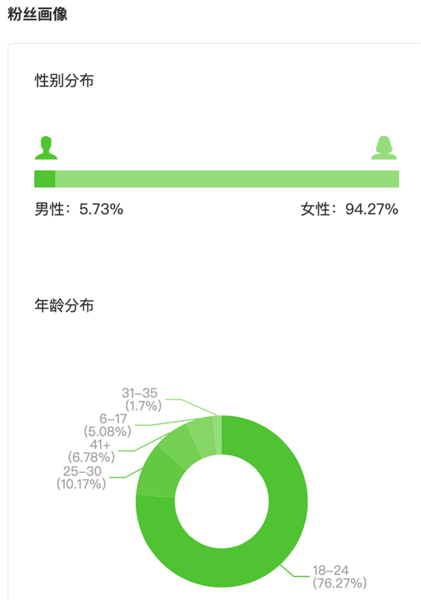 從她的直播粉絲畫(huà)像也可以看出這一點(diǎn),其中女性占比九成多,和孫一寧同年齡段的18-24歲的粉絲占比近八成,這與一般的顏值網(wǎng)紅的粉絲畫(huà)像有所區別。