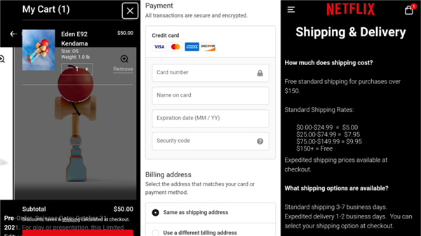 在購買(mǎi)方式上,Netflix.shop和奈飛原本的流媒體平臺賬號并不通用,非奈飛訂閱用戶(hù)也可以購買(mǎi)。配送則有標準配送和加急配送兩種選擇,前者大約3-7個(gè)工作日送達,后者1-2個(gè)工作日就能送達,不同的消費標準對應不同的運費,150美元以上可包郵。支付方式上目前只支持信用卡支付,消費者還可以選擇勾選郵件推送,從而獲得商品打折、促銷(xiāo)優(yōu)惠的信息。