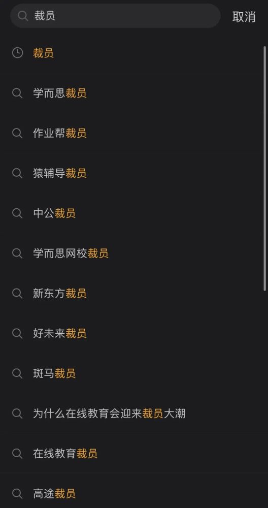 裁員的信息在5月開(kāi)始席卷整個(gè)在線(xiàn)教育行業(yè)。一張被廣為傳播的圖片,顯示的即是在微博上打入“裁員”兩字,跟隨出現的是各大在線(xiàn)教育公司。