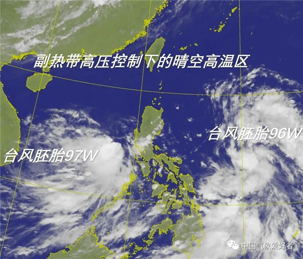 7月4日,雙臺風(fēng)胚胎和副高晴空區示意圖,底圖為H8云圖,中氣愛(ài)標注