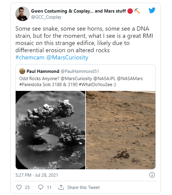火星地質(zhì)學(xué)家 Gwénaël Caravaca 在 Twitter 上對這個(gè)拱門(mén)發(fā)表評論,說(shuō)可以看到它像一條蛇、角或一個(gè) DNA 菌株。