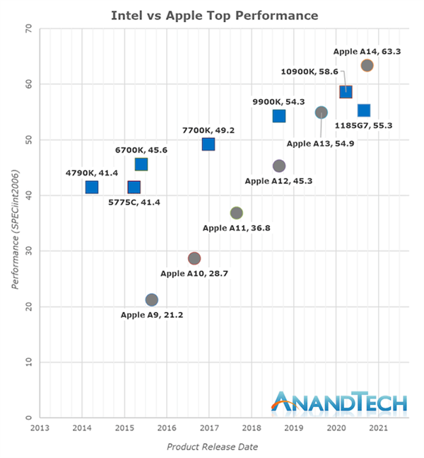 上面引用的 AnandTech 圖片和文章已經(jīng)解釋了蘋(píng)果與英特爾之間的故事,與其說(shuō)蘋(píng)果超越了英特爾,倒不如說(shuō)是英特爾停滯不前,而蘋(píng)果則保持著(zhù)一年一度的更新節奏穩步前進(jìn)。