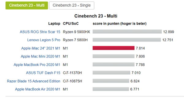 為證實(shí)這一觀(guān)點(diǎn),可以觀(guān)察上面的基準測試圖,該芯片比英特爾最新的四核 Tiger Lake 芯片快一點(diǎn)。這可能是最恰當的比較,因為 M1 也有 4 個(gè)快核心。顯然,就像英特爾一樣,這意味著(zhù) M1 無(wú)法與速度更快的 8 核 AMD 芯片相匹敵。