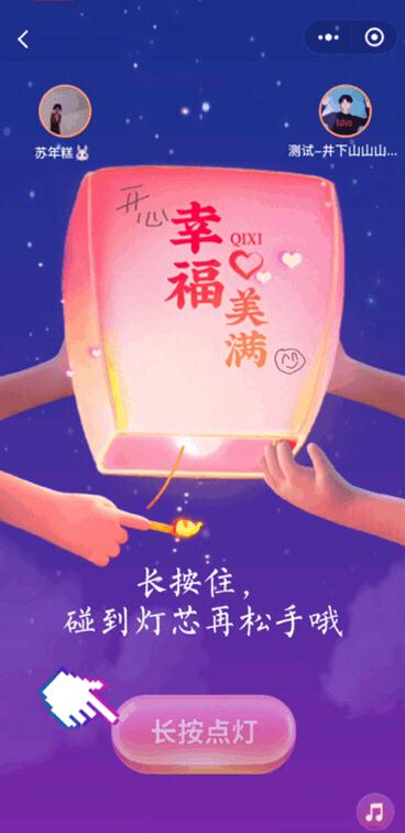 可以自己放飛,也可以邀請 ta 一起放飛,長(cháng)按頁(yè)面按鈕,控制火柴點(diǎn)燃燈芯,孔明燈點(diǎn)亮后就可以等候放飛啦。