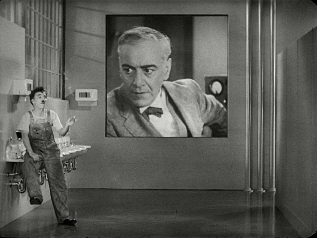 「休息時(shí)間,一名工人正在抽煙,而背后的電子屏幕上,老板的面孔突然出現并命令他回去繼續工作……」這是 1936 年上映的《摩登時(shí)代》中的場(chǎng)景。