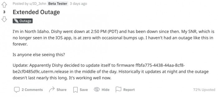 根據 Reddit 用戶(hù) ID_John 的說(shuō)法,在他的服務(wù)中斷后,Starlink 的用戶(hù)終端,也被稱(chēng)為 Dishy,在中間進(jìn)行了一次意外的軟件更新,之后服務(wù)恢復了,Starlink 也正常運行了。