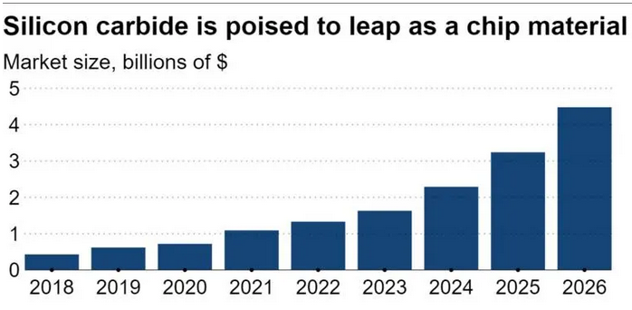 法國市場(chǎng)研究公司 Yole Developpement 預測,2026 年碳化硅能源芯片市場(chǎng)將比 2020 年增長(cháng) 6 倍,達到 44.8 億美元。