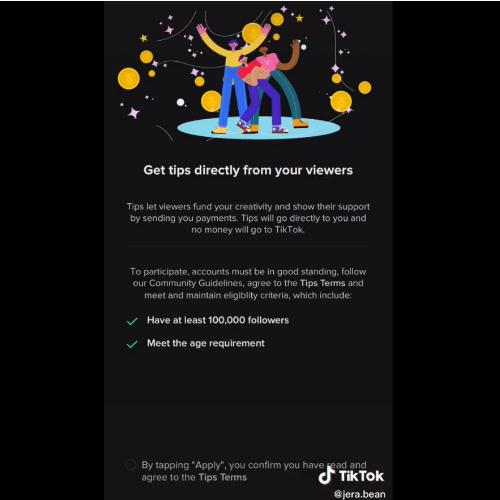 根據周四晚上分享的同一創(chuàng )作者的后續視頻,申請過(guò)程似乎進(jìn)展相當快。Jera Bean 的賬戶(hù)現在顯示一個(gè)“小費”按鈕,它將用戶(hù)引向一個(gè)頁(yè)面,在那里,用戶(hù)可以向創(chuàng )作者提供 5 美元、10 美元、15 美元或自己選擇的自定義金額(最低 1 美元)的小費。此外,該平臺允許以匿名的方式發(fā)送小費。