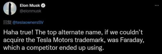馬斯克在評論中表示,如果當時(shí)無(wú)法獲得特斯拉汽車(chē)商標,那可能就要叫“法拉第”了,不過(guò)那個(gè)名字已經(jīng)被競爭對手用了。