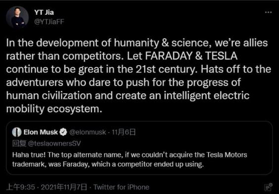 賈躍亭在推特上回應馬斯克的這一評論: