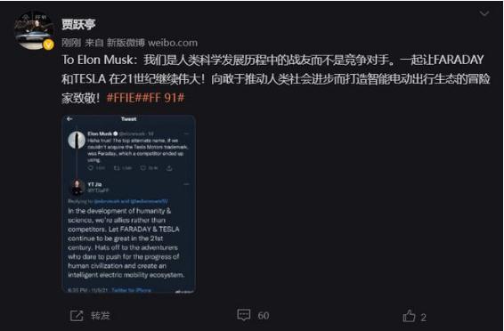 ▼ 賈躍亭也將這一回應發(fā)布到了微博,不過(guò)馬斯克在兩個(gè)平臺都沒(méi)有回復他