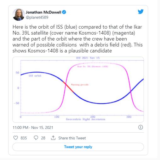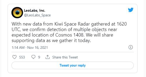 私營(yíng)太空追蹤公司 LeoLabs 在 Twitter 上證實(shí),它已經(jīng)觀(guān)察到多個(gè)物體現在正處于一顆名為宇宙 1408 號的俄羅斯老衛星的位置,據傳這顆衛星是反衛星試驗的目標。據太空追蹤專(zhuān)家喬納森-麥克道爾說(shuō),如果是這樣的話(huà),似乎很可能這次測試產(chǎn)生的碎片云就是周一早上威脅到國際空間站的那個(gè)。
