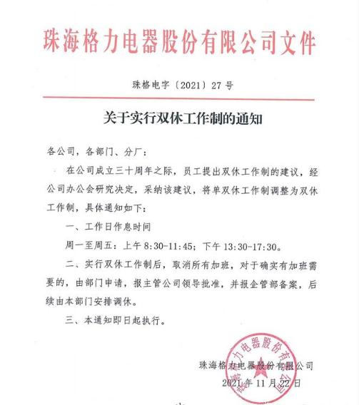 格力電器官方微博發(fā)布通知,將單雙休工作制調整為雙休工作制。工作時(shí)間為周一到周五上午8:30-11:45,下午 13:30-17:30。