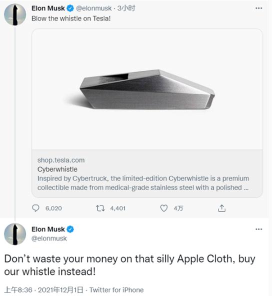 此外,特斯拉還不忘嘲諷蘋(píng)果一番:“不要在愚蠢的蘋(píng)果拋光布上花錢(qián),快來(lái)買(mǎi)特斯拉哨子吧!”