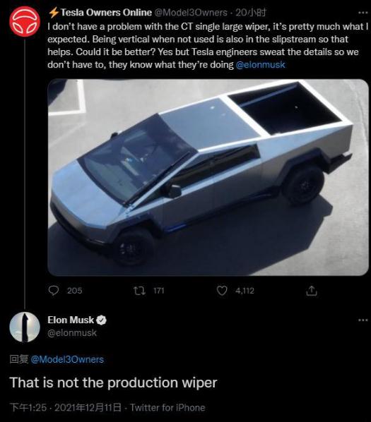 12 月 12 日消息,特斯拉電動(dòng)皮卡 CyberTruck 原型上最近出現的超大雨刷吸引了很多粉絲關(guān)注。但該公司首席執行官埃隆·馬斯克(Elon Musk)周六證實(shí),這款雨刷不會(huì )出現在 CyberTruck 量產(chǎn)版本上。