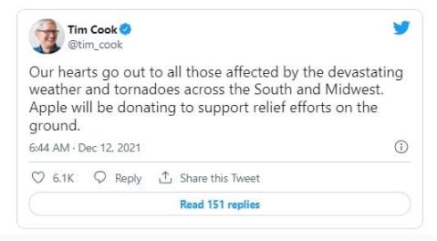 Cook 寫(xiě)道:“我們向所有受到南方和中西部毀滅性天氣和龍卷風(fēng)影響的人表示同情。蘋(píng)果公司將捐款支持當地的救援工作。”