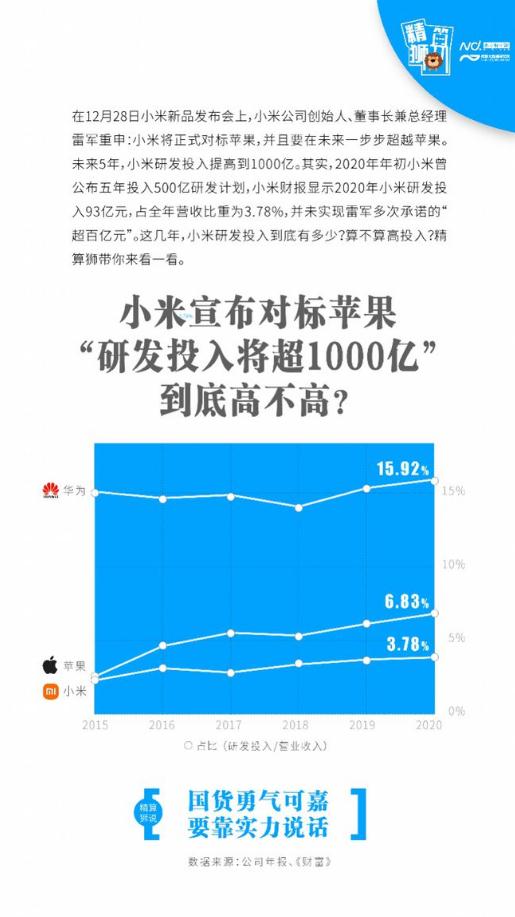12 月 28 日,小米 12 新品發(fā)布會(huì )上,小米公司創(chuàng )始人、董事長(cháng)兼總經(jīng)理雷軍重申:小米將正式對標蘋(píng)果,并且要在未來(lái)一步步超越蘋(píng)果。另外,小米還更新了研發(fā)計劃,未來(lái) 5 年公司研發(fā)投入要超提高至 1000 億元。其實(shí),2020 年年初小米曾公布五年投入 500 億研發(fā)計劃,小米財報顯示 2020 年小米研發(fā)投入 93 億元,占全年營(yíng)收比重為 3.78%,并未實(shí)現雷軍多次承諾的“超百億元”。這幾年,小米研發(fā)投入到底有多少?算不算高投入?精算獅帶你來(lái)看一看。