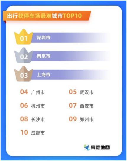 根據實(shí)際出行找停車(chē)場(chǎng)的頻次和花費時(shí)間綜合分析,高德地圖采用“停車(chē)難指數”作為各大城市停車(chē)難易的評價(jià)指標。報告顯示,全國出行找停車(chē)場(chǎng)最難的十大城市分別為:深圳、南京、上海、廣州、武漢、杭州、西安、長(cháng)沙、鄭州和成都。整體來(lái)看,南方城市普遍比北方停車(chē)更難。比如,深圳停車(chē)難指數為 11.6,表示深圳車(chē)友平均每 100 次駕車(chē)導航,約有 11.6 次到達目的地后未能停車(chē)需要再次查找停車(chē)場(chǎng),比全國主要城市停車(chē)難指數高 14.1%。
