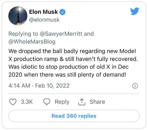 馬斯克寫(xiě)道:“我們在新款 Model X 的生產(chǎn)安排上嚴重失誤,目前還沒(méi)有完全恢復。”“2020 年 12 月,市場(chǎng)需求仍然很大,我們卻停止生產(chǎn)老款 Model X,真是愚蠢!”