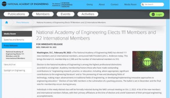 據悉,成立于1964年的美國國家工程院(NAE)是美國工程技術(shù)界水平最高的學(xué)術(shù)機構,當選國家工程院院士是授予工程師的最高專(zhuān)業(yè)榮譽(yù)之一。NAE表示,該學(xué)院評選院士的標準主要是“對工程研究、實(shí)踐或教育做出杰出貢獻”、“在新興或正在發(fā)展中的技術(shù)領(lǐng)域完成開(kāi)創(chuàng )性工作,在傳統領(lǐng)域取得重大進(jìn)展,以及開(kāi)發(fā)或實(shí)施工程教育的創(chuàng )新方法”。