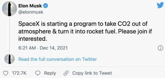 SpaceX公司計劃將大氣中二氧化碳轉化為火箭燃料。