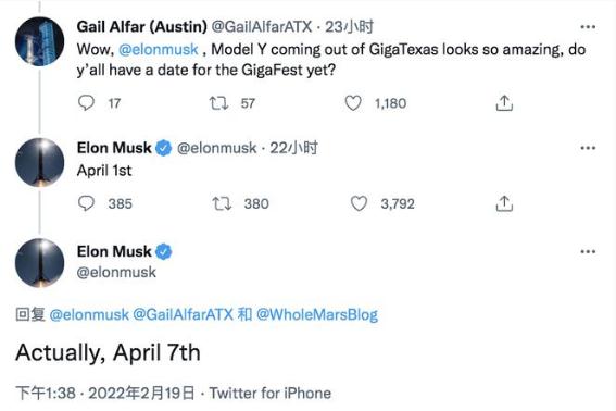 馬斯克在個(gè)人社交媒體 Twitter 上確認,這次活動(dòng)將于 4 月 7 日舉行。最初馬斯克表示活動(dòng)將于 4 月 1 日舉行。馬斯克可能很快意識到當天是愚人節,為了避免任何不必要的誤會(huì ),所以又把德克薩斯州超級工廠(chǎng)的慶?;顒?dòng)推遲了六天,以避免任何潛在的混亂。