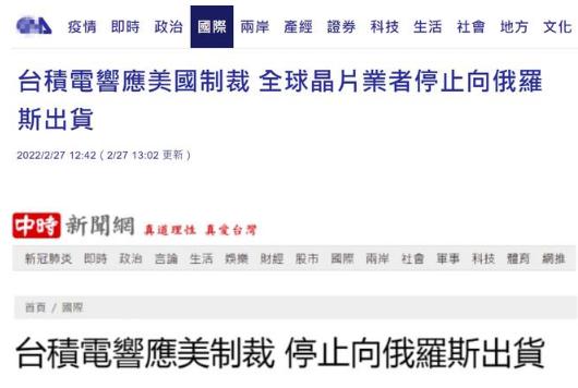 臺灣“中央社”27日消息聲稱(chēng),俄羅斯“入侵”烏克蘭,美國祭出制裁反制,包括臺積電在內的全球電腦芯片業(yè)者已開(kāi)始停止向俄羅斯出貨。