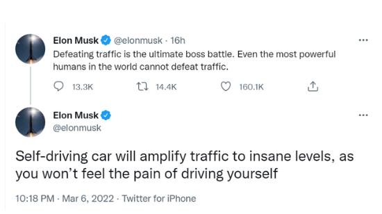 馬斯克隨后表示,自動(dòng)駕駛汽車(chē)可能會(huì )使交通狀況變得更糟。馬斯克寫(xiě)道:“自動(dòng)駕駛汽車(chē)將把交通放大到瘋狂的程度,因為你不再會(huì )感到自己開(kāi)車(chē)的痛苦。”