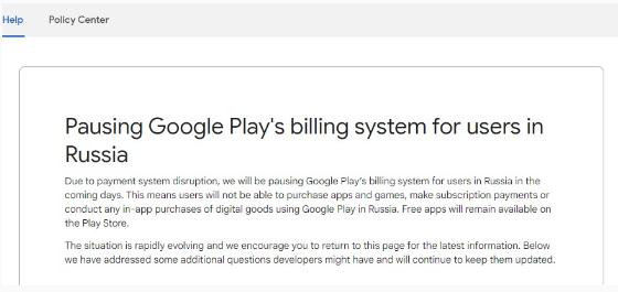 谷歌公司在開(kāi)發(fā)者社區發(fā)布公告,宣布暫停俄羅斯地區 Google Play 用戶(hù)支付。