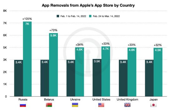 盡管蘋(píng)果經(jīng)常會(huì )從其 App Store 下架過(guò)時(shí)和被廢棄的應用,但是俄羅斯 App Store 自戰后 (2 月 24 日到 3 月 14 日) 下架的應用數量較 2 月前兩周 (2 月 1 日到 14 日) 增長(cháng)了 105%。在此之前的一個(gè)時(shí)期,俄羅斯 App Store 僅下架了 3404 個(gè)應用,與其他市場(chǎng)的蘋(píng)果 App Store 下架的應用數量相當,例如美國為 3422 款。