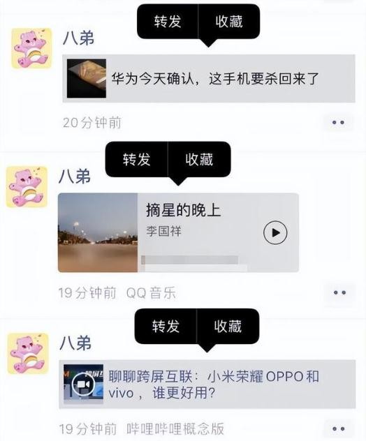 像公眾號推文、歌曲、視頻分享等等,都支持轉發(fā)功能。