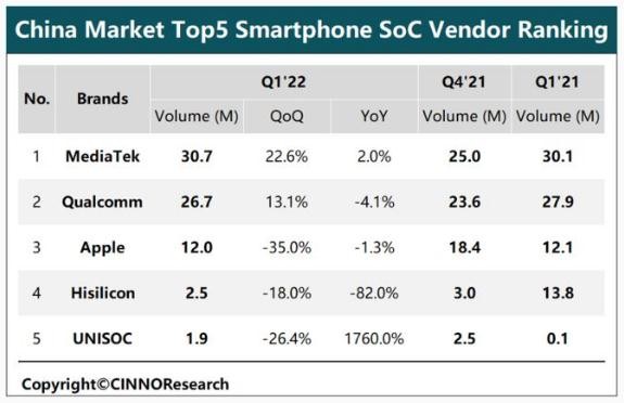 2022 年第一季度,中國大陸市場(chǎng)智能手機 SoC 出貨量圖源:CINNO Research
