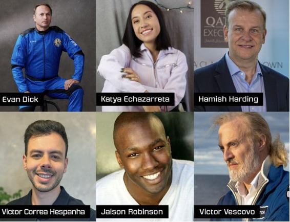 本次飛行也是新謝潑德亞軌道飛行器的第 21 次任務(wù),6 名乘客分別是投資人和 NS-19 亞軌道旅行乘客埃文·迪克(Evan Dick)、電氣工程師和 NASA 前測試負責人卡蒂亞·埃查扎雷塔(Katya Echazarreta)、公務(wù)機飛行員哈米什·哈丁(Hamish Harding)、28 歲土建工程師維克托·科雷亞·赫斯帕尼亞(Victor Correa Hespanha)、創(chuàng )辦了商業(yè)地產(chǎn)公司的冒險家賈森·羅賓遜(Jaison Robinson)、私募股權公司聯(lián)合創(chuàng )始人維克托·維斯科沃(Victor Vescovo)。