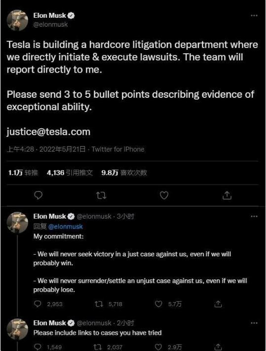 馬斯克在推特上宣布:“特斯拉正在組建核心訴訟部門(mén),我們將直接發(fā)起和執行訴訟。這個(gè)團隊將直接向我匯報工作。”