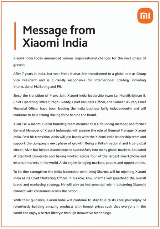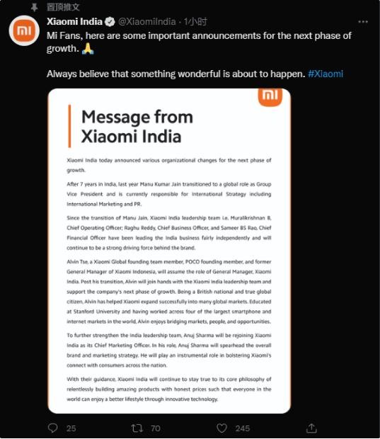 小米印度公司通過(guò)推特宣布公司組織調整:馬努?庫馬爾?賈恩(Manu Kumar Jain)去年以集團副總裁的身份轉為全球角色,目前負責包括國際營(yíng)銷(xiāo)和公關(guān)在內的國際戰略;小米印尼公司前總經(jīng)理謝子陽(yáng)(Alvin Tse)將擔任小米印度公司總經(jīng)理一職;阿努吉?夏爾馬(Anuj Sharma)將重新加入小米印度,擔任其首席營(yíng)銷(xiāo)官。