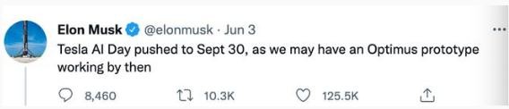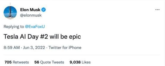 特斯拉的第二次人工智能日活動(dòng)原定于 8 月 19 日舉行,馬斯克將其推遲了六周,看起來(lái)是在等待去年公布的人形機器人 Optimus(擎天柱)完工。他后來(lái)又發(fā)推文補充說(shuō),特斯拉第二次 AI Day 將是“史詩(shī)級的”。