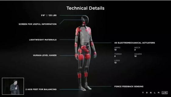 人形機器人 Optimus 身高 1.72 米,體重 56 公斤,類(lèi)似一位普通成年男性,比馬斯克矮一點(diǎn)。馬斯克曾特別強調,“你可以逃離它,且你有很大機會(huì )打贏(yíng)。”Optimus 還擁有人類(lèi)水平的手,可以 8km/h速度運動(dòng),其配備了 FSD 計算機和自動(dòng)駕駛攝像頭。