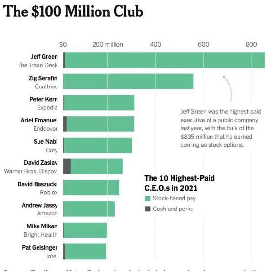 2021 年,美國收入最高的 10 位 CEO 的薪酬全部超過(guò)了 1 億美元,這在歷史上是第一次。他們的平均薪酬為 3.3 億美元,也創(chuàng )下了有史以來(lái)的最高。在他們的薪酬中,股票獎勵占據了絕大部分。