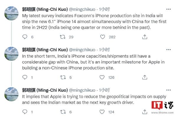 天風(fēng)國際分析師郭明錤今日在推特爆料,根據他最新調查顯示,蘋(píng)果最大的供應商富士康在印度的 iPhone 生產(chǎn)基地或將在 2022 年下半年中(2H22),首次與中國同時(shí)出貨新款的 6.1 英寸 iPhone 14。而在此前,印度通常會(huì )比中國晚一個(gè)季度出貨。