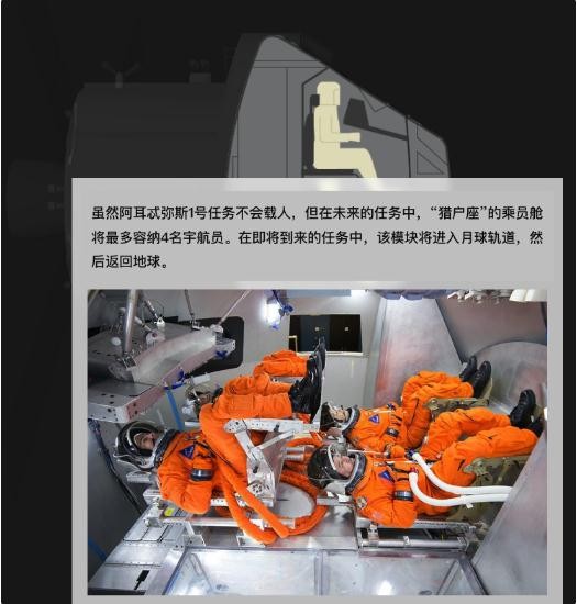 為了更好地了解人類(lèi)在飛船里的生活狀況,NASA 在飛船里安裝了一個(gè)假人。NASA 稱(chēng),這個(gè)名為穆尼金?坎波斯 (Moonikin Campos) 的假人是以阿波羅 13 號時(shí)代的電氣工程師阿圖羅?坎波斯 (Arturo Campus) 的名字命名的,它將配備傳感器,以測量人類(lèi)在飛行過(guò)程中會(huì )經(jīng)歷的輻射以及“振動(dòng)和加速”。