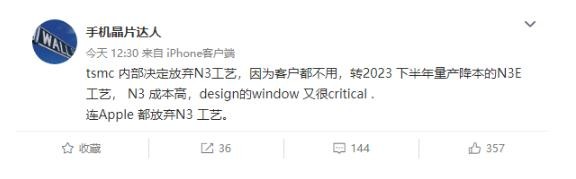 臺積電內部已決定放棄N3工藝 因客戶(hù)幾乎都不愿意用 10:51:54