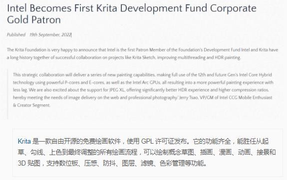 Krita 基金會(huì )宣布,英特爾已成為 Krita 基金會(huì )的首個(gè)企業(yè) “金牌” 贊助商,每年至少為這個(gè)開(kāi)源的繪畫(huà)軟件貢獻 3 萬(wàn)歐元。