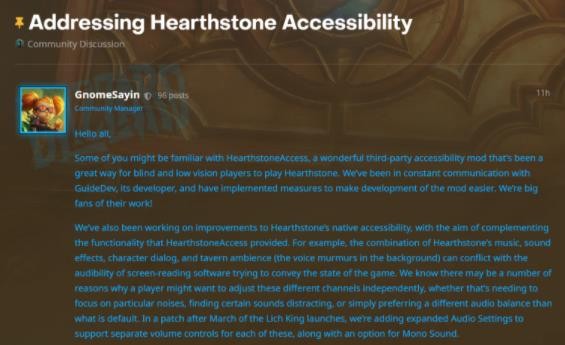 此前,有語(yǔ)音插件開(kāi)發(fā)者 GuideDev 為《爐石傳說(shuō)》的盲人玩家推出過(guò)輔助插件,通過(guò)語(yǔ)音輔助幫助他們進(jìn)行游戲。但因為個(gè)人力量?jì)?yōu)先, GuideDev 表示無(wú)力繼續進(jìn)行插件更新。之后有盲人玩家開(kāi)始尋找解決方案,并向暴雪請愿幫助他們繼續游戲。