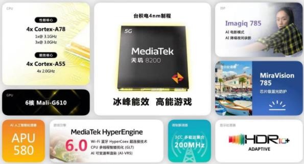 聯(lián)發(fā)科發(fā)布天璣 8200 5G 移動(dòng)芯片,新品采用 4nm 制程,八核 CPU 架構包含 4 個(gè) Cortex-A78 大核以及 4 個(gè) Cortex-A55 小核,最高主頻最高達 3.1GHz,搭載 Mali-G610 六核 GPU。