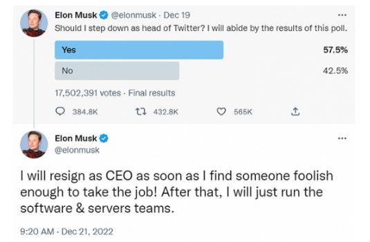埃隆?馬斯克在推特發(fā)文對網(wǎng)友的投票結果作出回應,稱(chēng)會(huì )盡快找到一個(gè)足夠傻的人來(lái)接任推特 CEO 一職,而一旦找到自己便辭職。馬斯克稱(chēng),辭任后他本人將只負責管理軟件和服務(wù)器團隊。