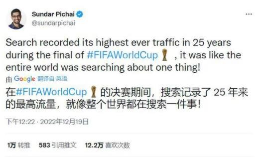 FIFA 卡塔爾世界杯決賽期間刷新了谷歌成立 25 年以來(lái)的最高流量紀錄。谷歌首席執行官桑達爾?皮查伊(Sundar Pichai)在最新推文中宣布流量打破公司成立 25年以來(lái)紀錄。