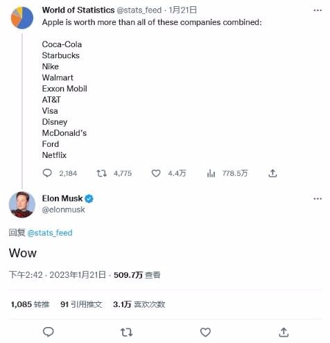 The World Of Statistics 在最新推文中表示,蘋(píng)果公司的市值已經(jīng)超過(guò)了可口可樂(lè )、耐克等 11 家藍籌公司的市值總和。隨后馬斯克轉發(fā)了這條推文,并評論道:“WoW”。