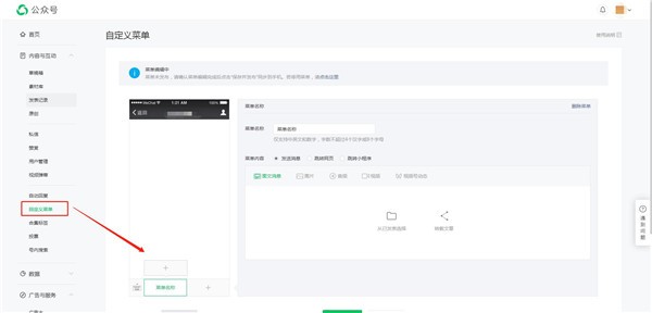2.進(jìn)入到公眾號后臺在左側菜單找到自定義菜單,點(diǎn)擊進(jìn)入就可以看到右側設置自定義菜單的位置。